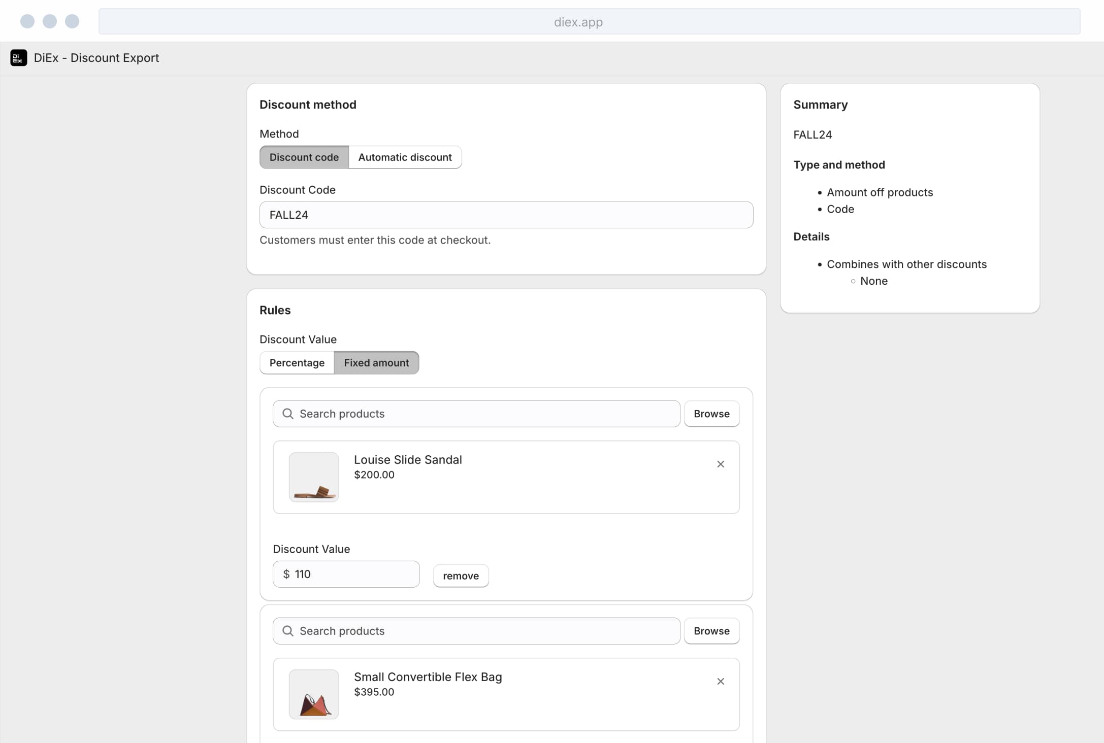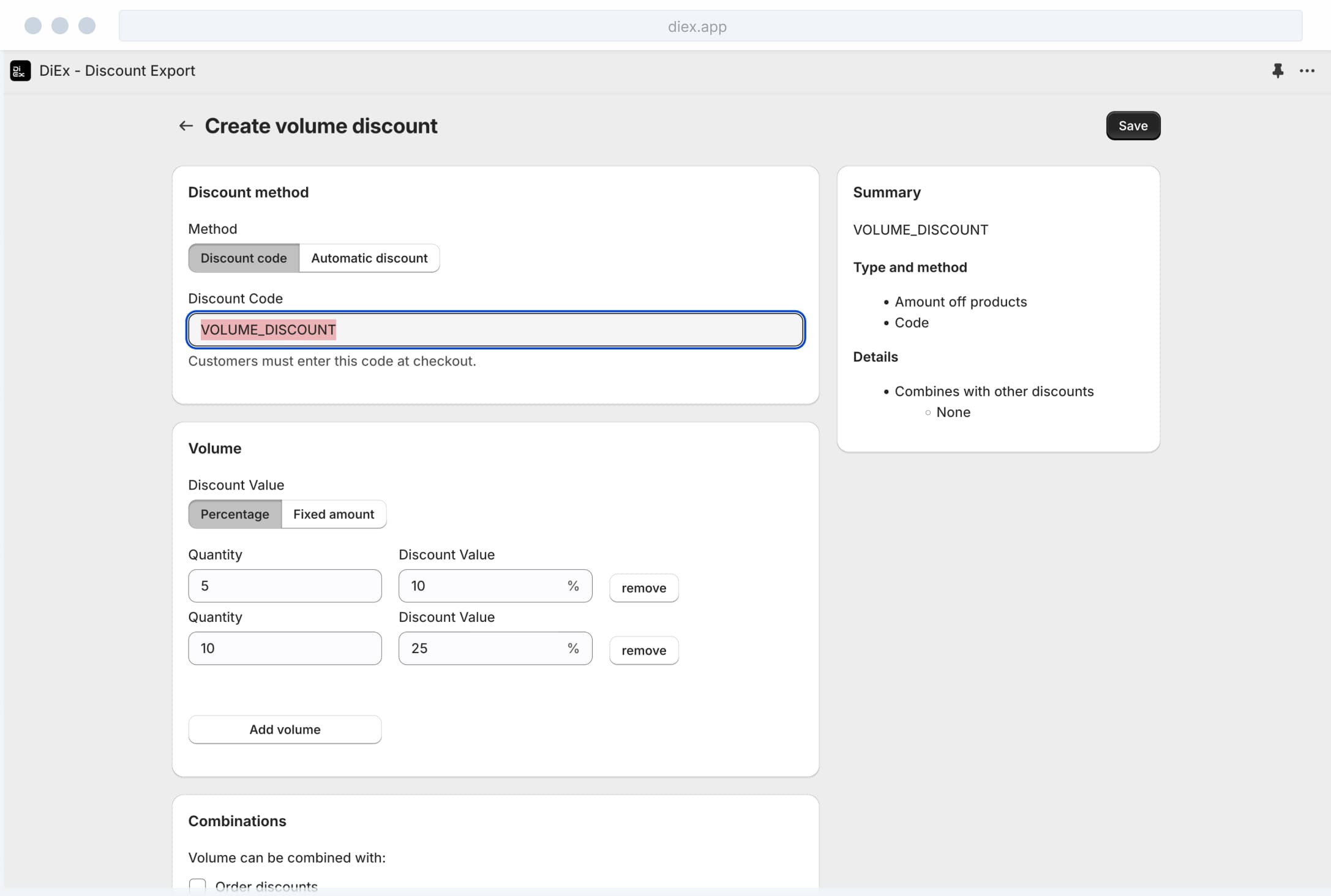 Discount Expert allows you to create bulk discount codes, volume discounts, and variable discounts.